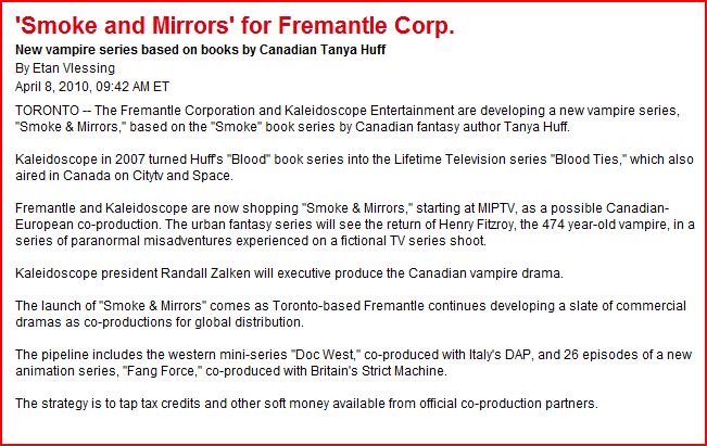 Tanya Huff potwierdziła na Tweeterze, że trwają przygotowania do nowego projektu, ale są one jeszcze w bardzo wczesnym stadium. Poza tym, w prasie źle podano miasto, do którego przeprowadza się Henry. To nie Los Angeles lecz Vancouver. No oczywiście - tak przecież wskazywały ostatnie odcinki Blood Ties :-)